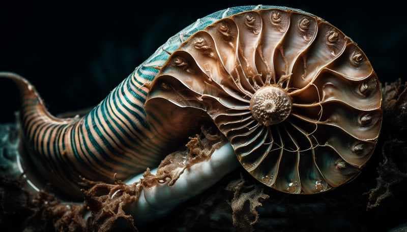 Nahaufnahme eines Nautilus-Querschnitts, der die natürliche Spiralform zeigt, die dem Goldenen Schnitt folgt und für Balance und Ästhetik steht.